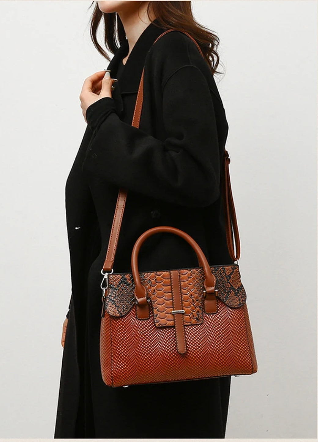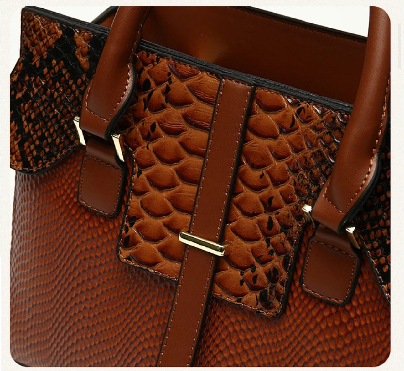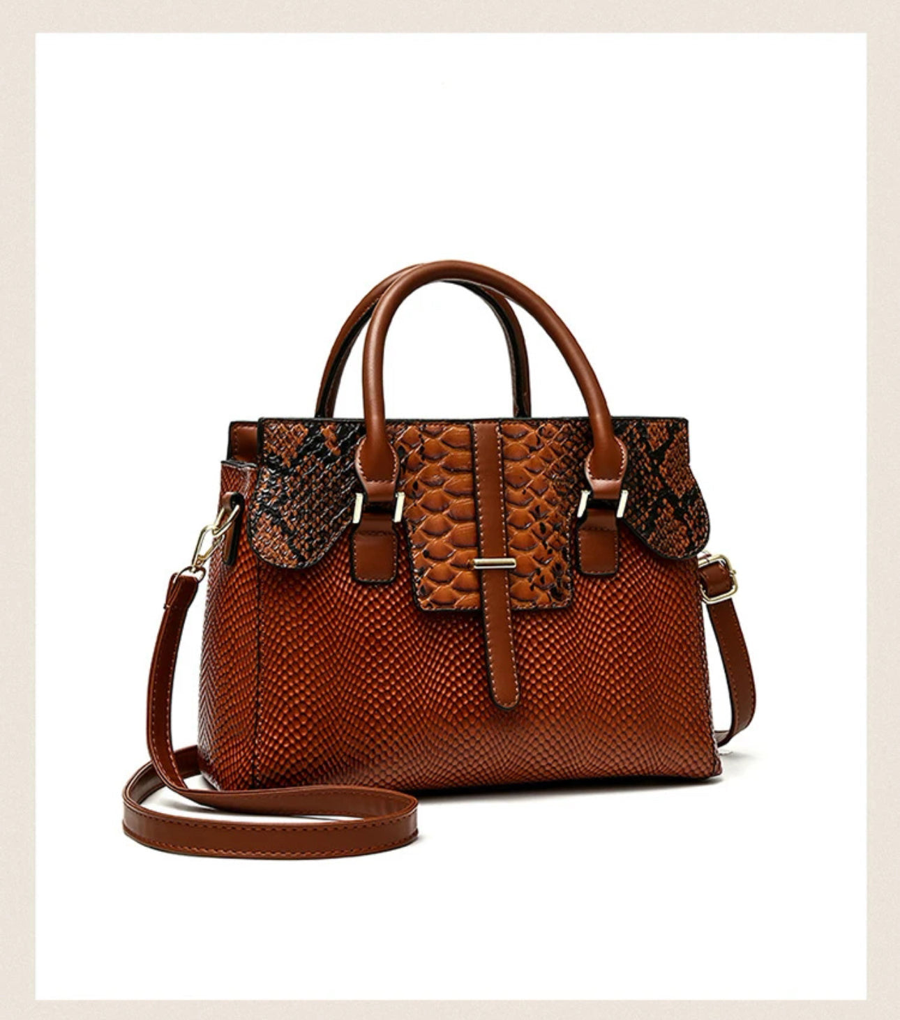 This handbag is a stunning, structured piece featuring a rich, textured faux snakeskin pattern in warm shades of brown.