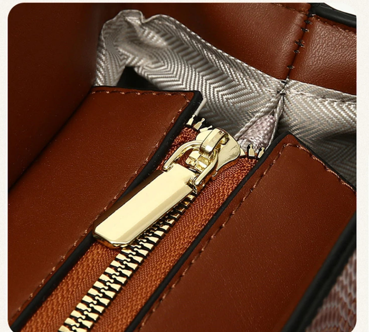 It includes dual top handles in smooth brown leather and a front flap secured by a slim gold-tone buckle detail.