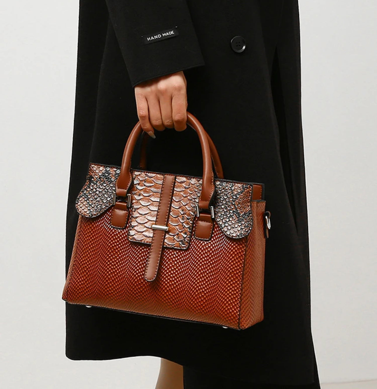 A medium-sized structured handbag—perfect for daily essentials with a classy, textured finish.